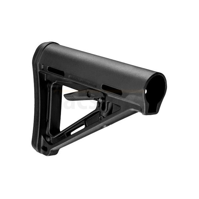 The MOE Stock Com-Spec model (Magpul Original Equipment) is a drop-in replacement buttstock for AR15/M16 carbines using Com-Spec sized receiver extension tubes. Designed for light, fast action the streamlined A-frame profile avoids snagging and shields the release latch to prevent accidental activation. The Com-Spec Model includes a standard 0.55 inch rubber butt-pad which provides positive shoulder purchase to prevent slippage even with body armor or modular gear.