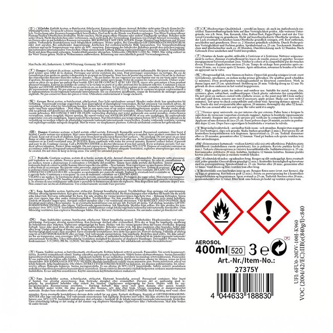 High quality primer, colour: light grey for indoor and outdoor use improves adhesion and opacity of paintwork suitable for metal, stone, clay, ceramics, glass, rattan/bast, cardboard/paper check plastic substrates for compatibility do not spray on surfaces coated with synthetic resins, as the paint may lift dust-dry and overpaintable after ca. 20 min completely dry after ca. 12 h Maximum purchase quantity per order = 60 pieces