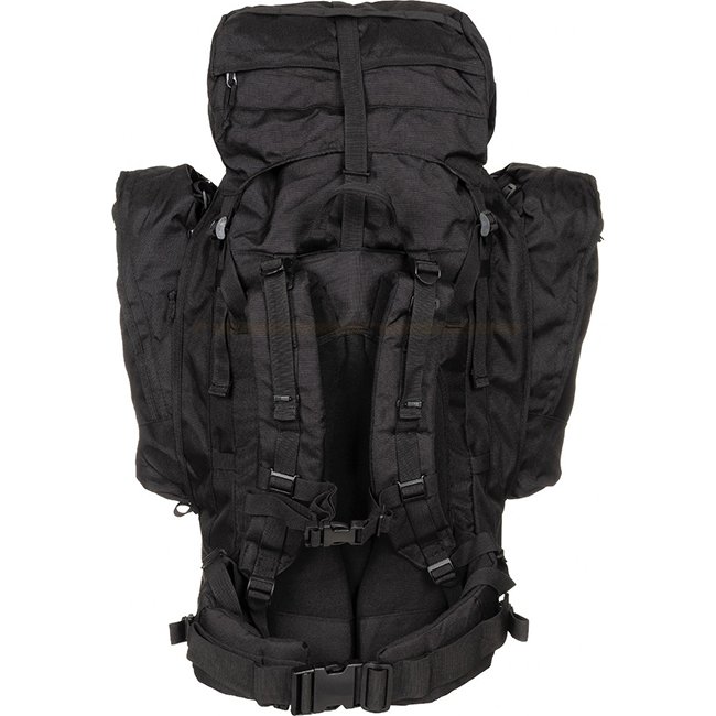 MFH Backpack Alpine 110 - Black: Adjustable, padded straps, hydration pack clip, aluminum frame, multiple compartments, detachable side bags. Capacity: 110l. Dimensions: 50x70x30cm. Weight: 2.2kg. Material: 100% Polyester.