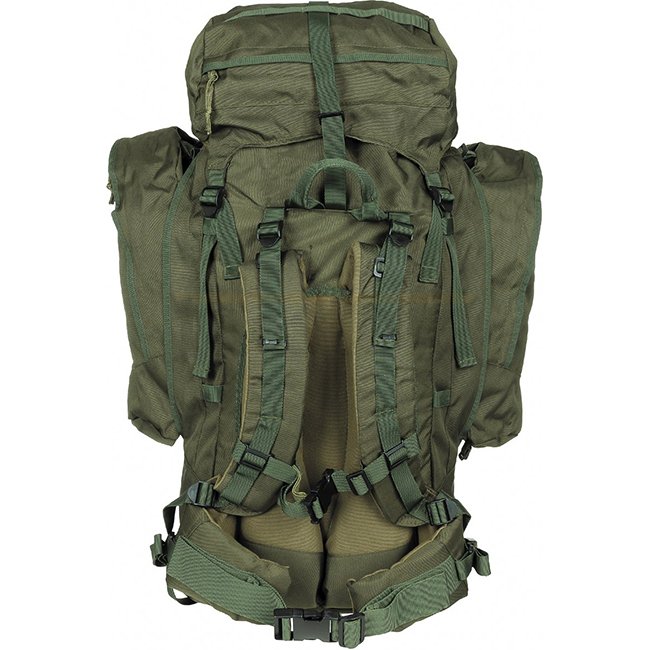 MFH Backpack Alpine 110 - Olive with adjustable shoulder straps, chest strap, aluminium frame, detachable lid with pockets, main compartment with bottom compartment, detachable side bags, 2 compression straps, elastic fasteners, and 110L capacity.