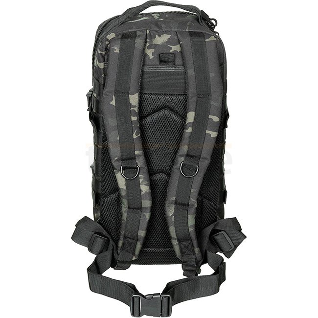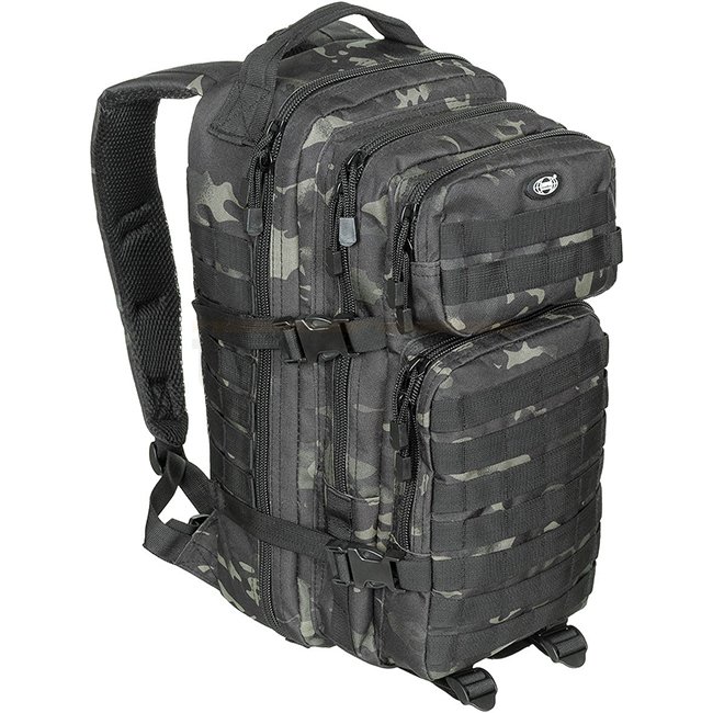 MFH Backpack Assault 1 - Camo - Adjustable, padded shoulder straps, detachable waist strap, large compartments, hydration pack velcro, breathable mesh paddings, pen holders, Molle loops. Capacity: 30L. Dimensions: 23x44x24cm. Weight: 1.2kg. Material: 100%