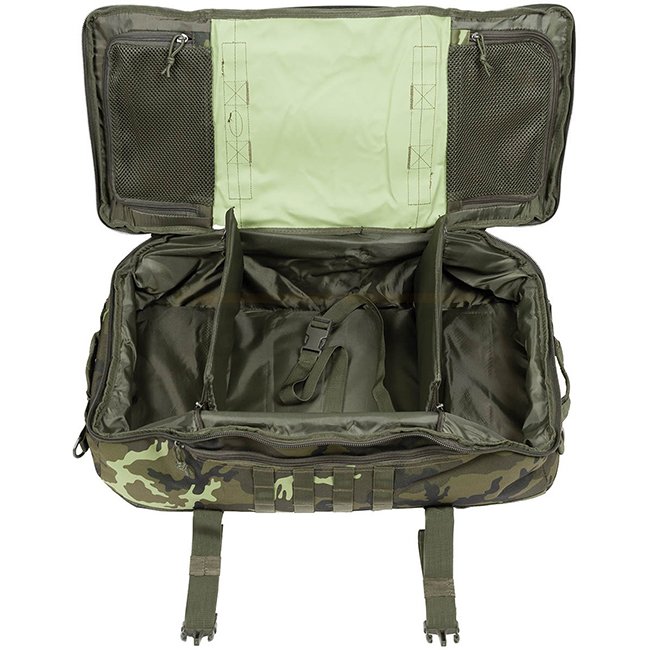 MFH Backpack Bag Travel - M95 CZ Camo with detachable shoulder strap, padded back, stowable carrying system, multiple handles, Molle attachment loops, numerous compartments and pockets, compression straps, and mesh pockets. Made of 100% Polyester. Capacit