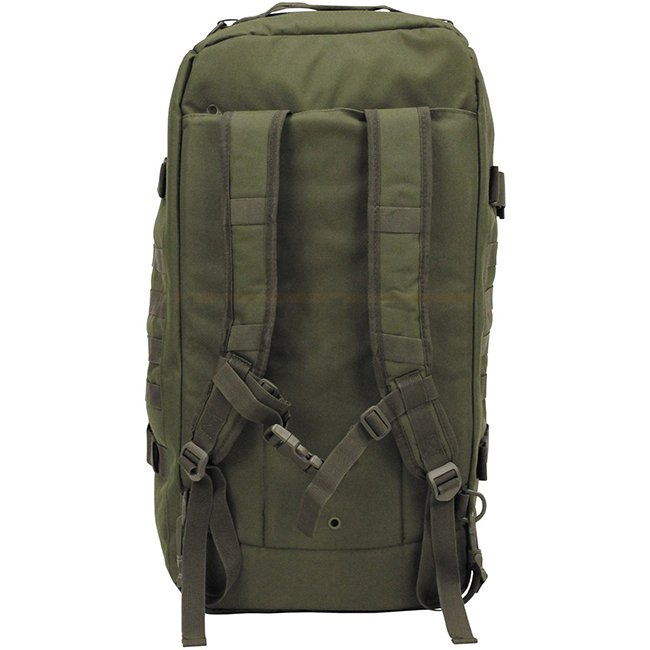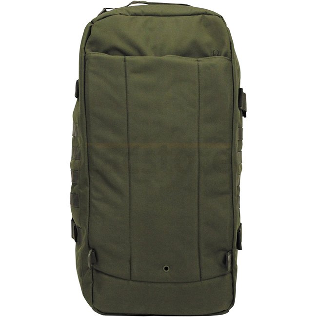 MFH Travel Backpack Bag in Olive with 48L capacity. Features include detachable and adjustable shoulder strap, padded back panel, top carrying handle, multiple carrying handles, Molle attachment loops, various compartments, side pockets, compression strap