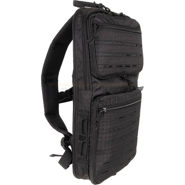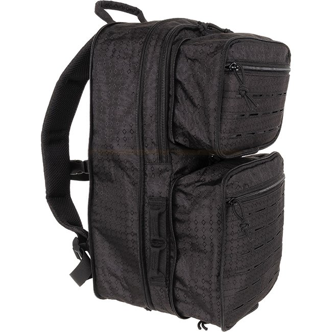 MFH Backpack Compress OctaTac - Black: Adjustable, padded shoulder straps, D-rings, chest strap, breathable mesh padding, multiple zip pockets, Molle attachment loops, laser cut design. Capacity: 7-15L. Dimensions: 23 x 42 x 24 cm. Weight: 460g. Material: