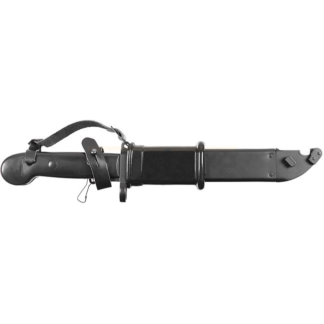 High-quality black AK47 Bayonet with smooth blade and saw back, metal cross-guard, and black sheath with rubber insulation. Can be used as a wire cutter with the sheath. Features smooth grip plates, a leather strap for fixation, and a press button on the