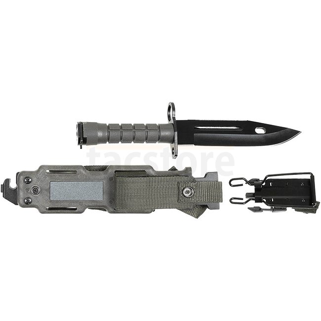 MFH Bayonet M9 - Olive: Versatile bayonet with smooth edge, saw back, wire cutter, rifle barrel hole, textured handle, locking device, and more. Total length: ca. 30.5 cm. Blade: ca. 18 cm. Weight bayonet: ca. 460 g. Weight with sheath: ca. 750 g.
