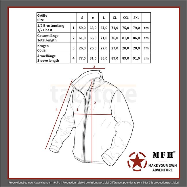 Stay warm and stylish with the MFH British Thermal Jacket in Black - 3XL. Featuring a 2-way front zip, concealed pockets, adjustable collar, hidden hood, and drawstrings for the perfect fit. Made of 100% Nylon with Polyester lining and filling.