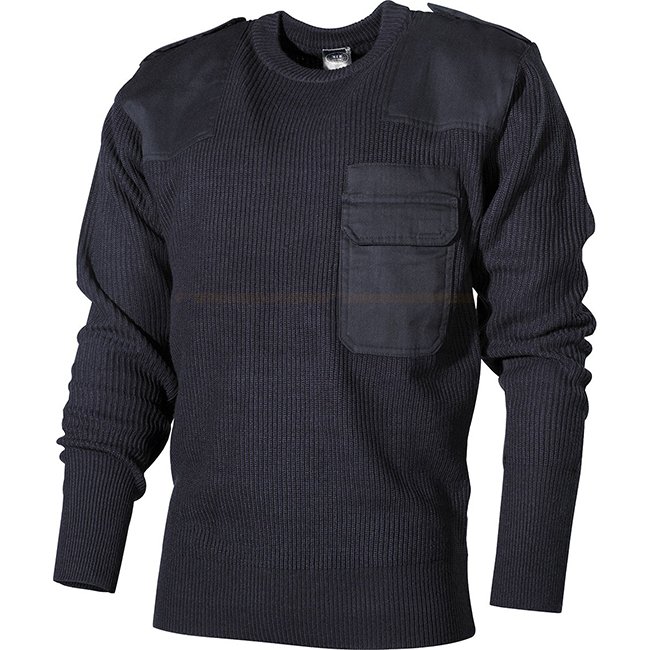 Stay warm and stylish with the MFH BW Pullover Chest Pocket made from Polyacryl in Blue. This pullover features a patch pocket with flap and Velcro on the left chest, additional pen pockets, 2 epaulettes with Velcro, facing on the elbows, a knitted collar
