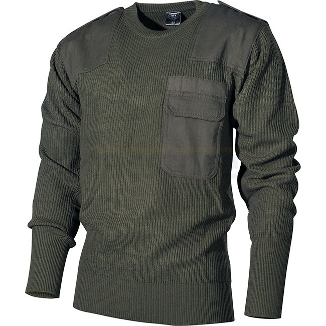 Stylish olive MFH BW Pullover with chest pocket, epaulettes, knitted collar, and German flag details. Made of 100% Acrylic material with Polyester-Cotton trimming.