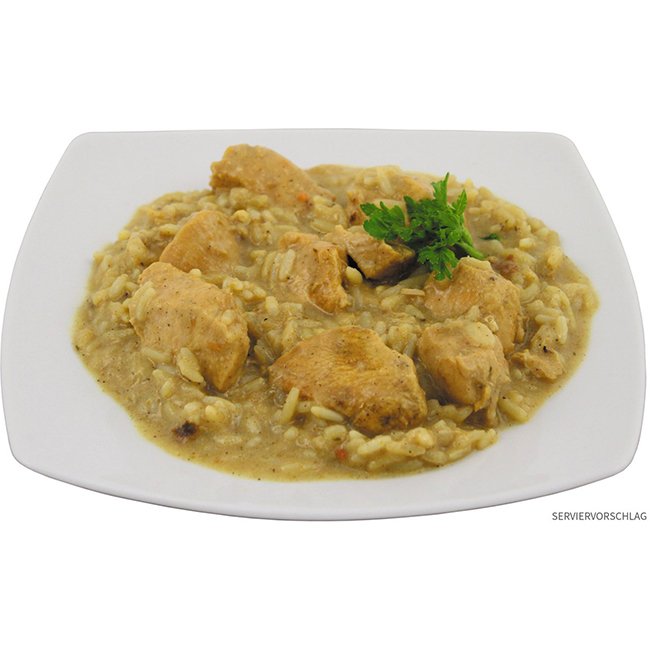 Handmade from local ingredients in Germany without preservatives and flavour enhancers no mechanically seperated meat processed store dry at room temperature Ingredients : chicken breast fillet 37%, rice 20%, drinking water, wheat flour, onion, cream, milk, stone salt, pepper, curry, sugar, potato flour Nutritional values per 100 g: energy in kJ/kcal: 519/124 fat 3,4 g, of which saturates 1,22 g carbohydrates 16,16 g, of which sugars 0,31 g protein 6,96 g salt 0,58 g Content: 400 g