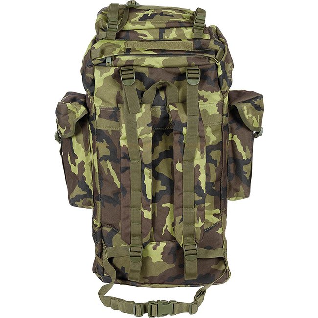 MFH Combat Backpack 65 l - M95 CZ Camo: Adjustable, padded shoulder straps, waist strap with click closure, top carrying handle, lid with attached pocket, main compartment with separable bottom compartment, various pockets and straps. Capacity: 65 l. Dime