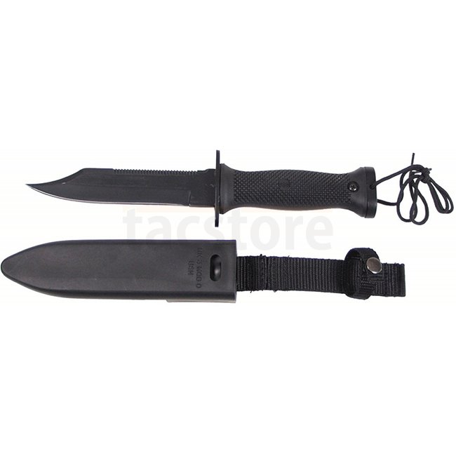 High-quality MFH Combat Knife MK3 in black. Versatile and reliable, perfect for various outdoor activities. Features smooth edge and saw back, metal cross-guard, and textured grip plates. Comes with a nylon belt loop, press button, and plastic sheath. Tot