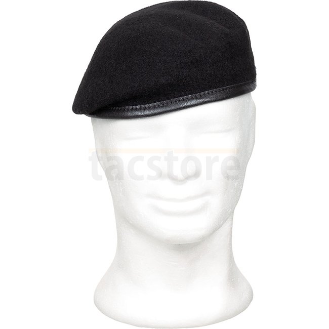 MFH Commando Beret - Black - 61. French commando beret. German style, small and flat with leather hem edge. 2 ventilation eyelets. Material: 100% wool outer, 100% polyester lining, leather hem. Contains non-textile parts of animal origin.
