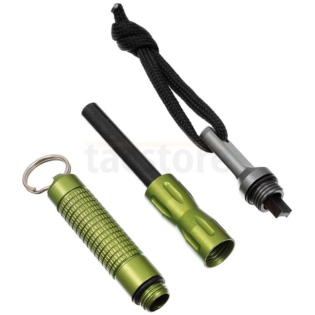 This compact fire starter features a scraper and a screw-together 3-piece construction for easy storage and transport. The aluminum housing serves as a sturdy grip, ensuring a secure hold even in challenging conditions. Equipped with a cord lanyard and key ring for versatile carry options.