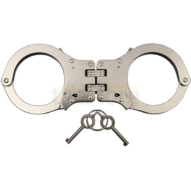 High-quality handcuffs with "double-lock". 2 symmetrical cuffs with lock groove and hinge. Length: ca. 21.5 cm. Material: 100% Steel.