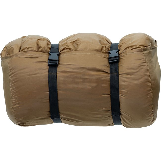 MFH Israeli Pilot Sleeping Bag in Coyote color with temperature range of -10¯C to +15¯C. Features 2-layer filling, can be combined with another bag, and used as a blanket with a full-length zip. Includes transport bag, adjustable packing straps, and click