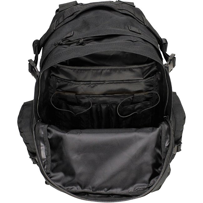 Padded and adjustable shoulder- and waist straps, adjustable chest strap padded back part with removable frame plate and 1 slide-in pocket with zip 1 carrying handle on top and both sides main compartment completely unfoldable with 2-way zip, 3 openings to the main compartment for drinking tube or cable as well as 4 pack straps and 2 mesh pockets with zip 1 front pocket with 2-way zip and inside carabiner various slide-in pockets and pen holders 1 attached slide-in pocket with lateral zip and Molle attachment loops 1 bottom front pocket with 2-way zip with mesh inserts and Molle attachment loops 2 side pockets with 2-way zip and Molle attachment loops, click closures 2 compression straps on each side Capacity: ca. 45 l Dimensions: ca. 42 x 53 x 30 cm (W x H x D) Weight: ca. 2,3 kg