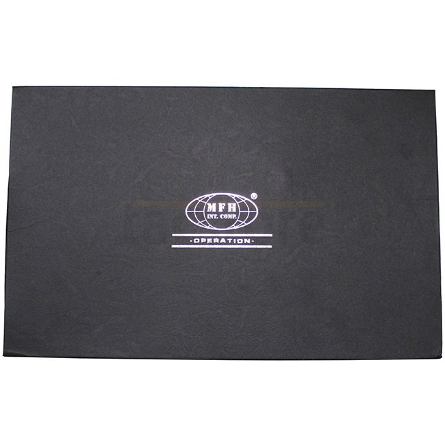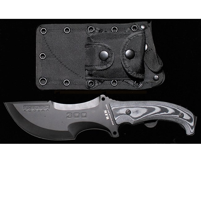 MFH Knife Operation Kodiak - Black: Curved black blade, finger guard, Micarta handle, nylon sheath with pouch, grindstone, and fire starter. Blade thickness: 6mm, Steel 420. Total length: 30cm. Blade: 17cm. Weight knife: 540g. Weight with sheath: 740g.
