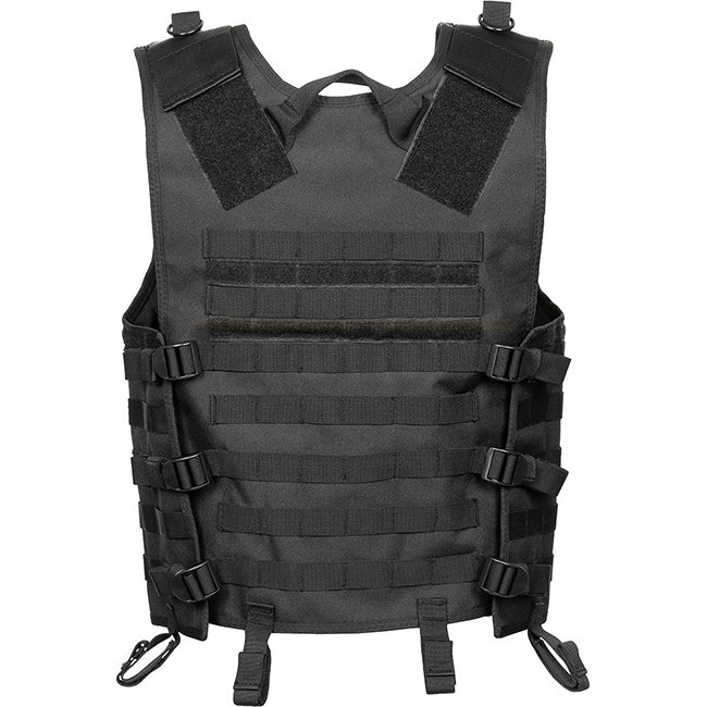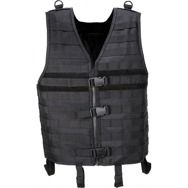 MFH MOLLE Vest Light - Black: Tactical vest with modular system, durable zip with clip closure, adjustable on shoulder, Molle loops, velcro panels, rescue handle, 6 waistband loops, 3 inside pockets. 100% Polyester.