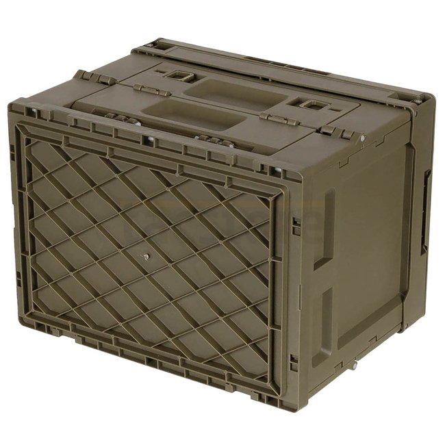 This folding crate offers an efficient solution for storage and transport in tight spaces. It collapses flat, is stackable, and features an integrated lid as well as a front flap secured with two locking sliders.