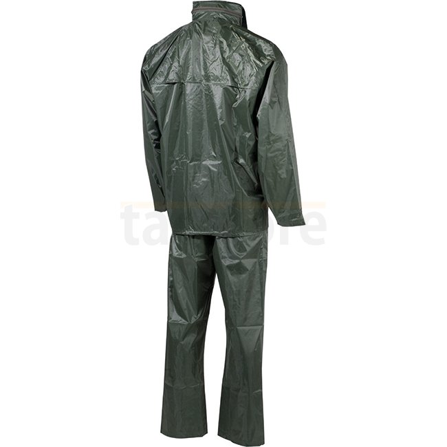 MFH Rain Suit Two-Piece - Olive - L. Jacket with concealed zip, 2 press buttons, hidden hood, back ventilation, armpit eyelets, sleeve hem buttons, waist drawstring, pants with elastic waistband, slit pockets, adjustable bottom hem. Material: 100% Polyest
