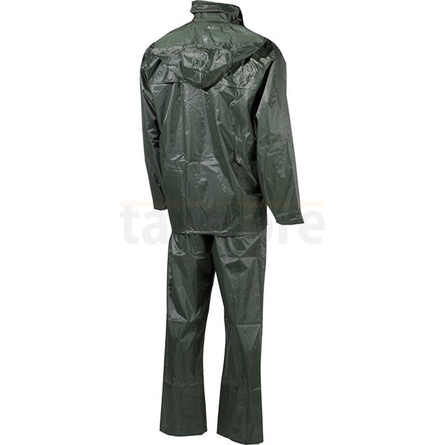 Stay dry and stylish with the MFH Rain Suit Two-Piece in Olive, size XL. This jacket features a concealed zip, press buttons, hidden hood, back ventilation, and more. Pants with elastic waistband and adjustable bottom hem. Made of 100% Polyester.