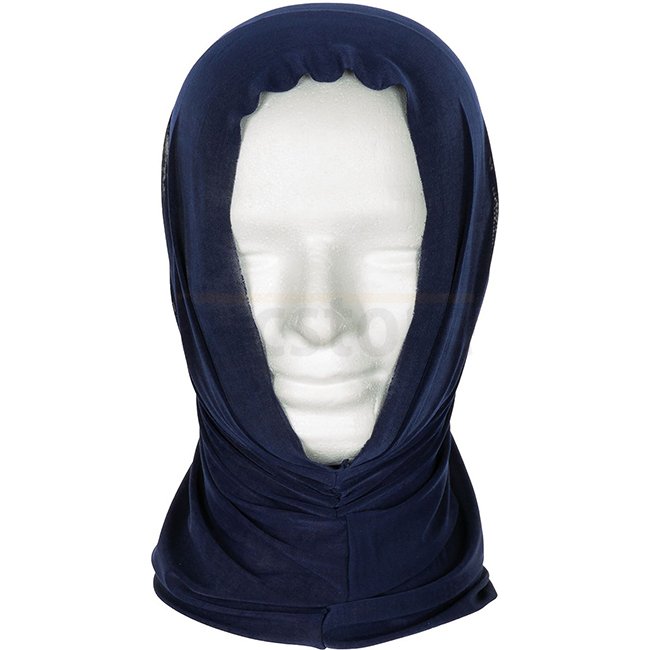 Multifunctional navy blue round scarf made from polyester and elastane blend.