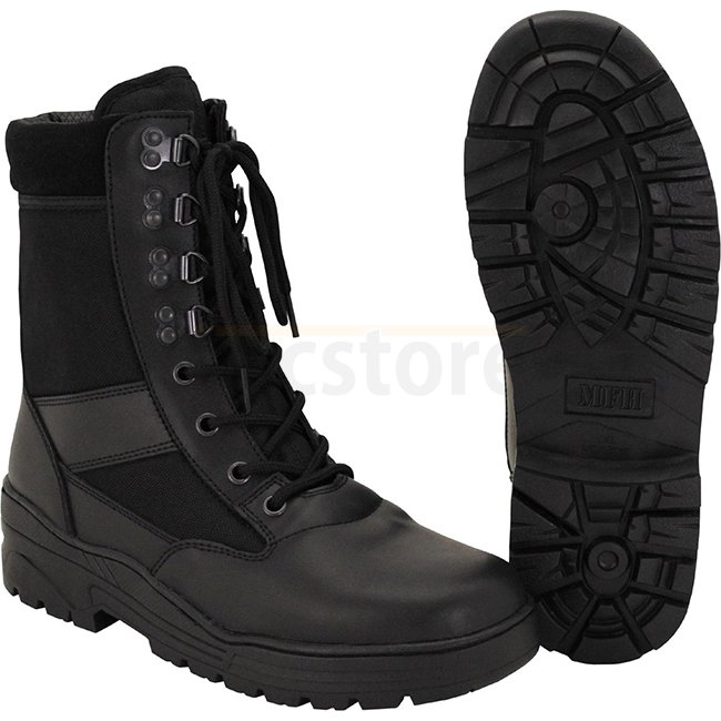 Lightweight and comfortable security boots with stable metal eyelets for optimum fixation and a non-slip, tough and oil-resistant sole. Made of breathable action-leather and polyester, featuring a padded top bootleg and tongue as well as removable inner s