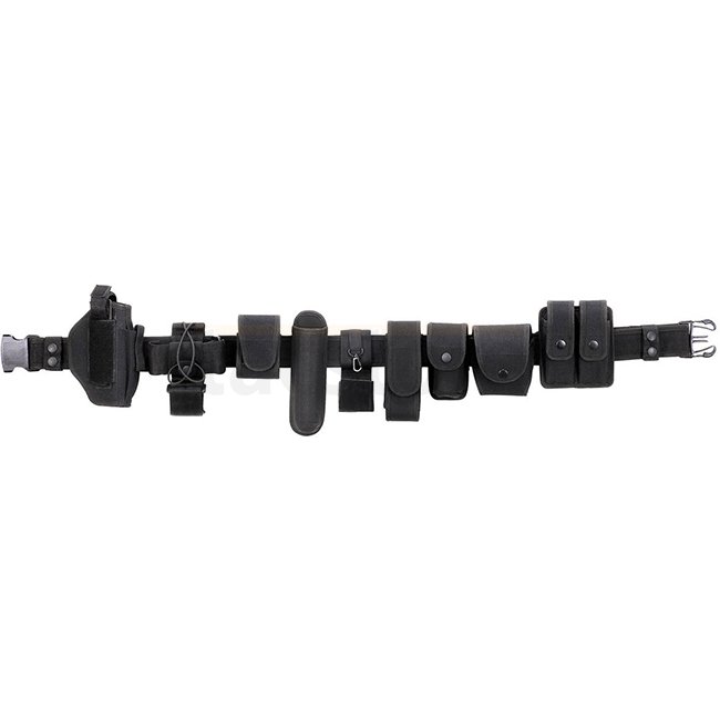 Extensive belt system durable due to 100 % nylon 1000D and PP inlay all parts detachable and adjustable belt adjustable by velcro durable click closure holster for small to medium size pistols with velcro and add. ammo pouch with velcro radio holder with elastic, adjustable by velcro small pouch (ca. 7 x 5 x 2 cm) open pouch (ca. 14 x 2,5 x 2,5 cm) for e.g. Maglite pouch for e.g. cs-gas with press button, round inside (ca. 12 x 4,5 x 4,4 cm) baton or flashlight holder with velcro and hook pouch with press button, round inside (ca. 7,5 x 5 x 4 cm) double ammo pouch with velcro and press button handcuff etui with velcro and press button 2 belt clips with 2 press buttons