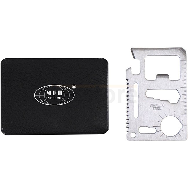 MFH Survival Pocket Tool - Silver: Compact and versatile tool card with 11 functions for all your survival needs. Includes can opener, knife, screwdriver, ruler, bottle opener, saw, and more. Perfect for everyday carry and emergencies. Dimensions: 6.8 x 4