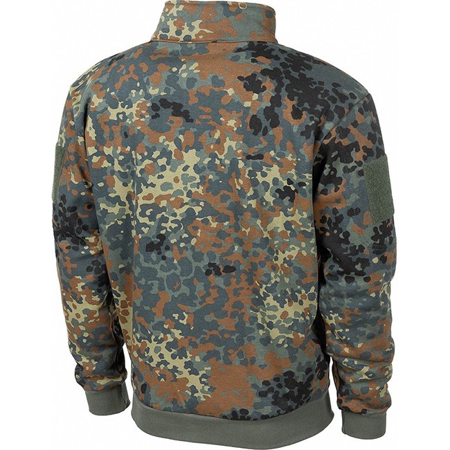 Enhance your tactical gear with the MFH Tactical Sweatjacket in Flecktarn pattern. Featuring front zip, knitted cuffs, stand-up collar, multiple zip pockets, and velcro panels. Made of 60% Cotton and 40% Polyester blend.