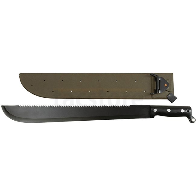 Get the MFH US Bolo Machete in sleek black finish with saw back, bakelite handle, finger guard, eyelet, & sheath. Ultimate tool, compact yet effective.
