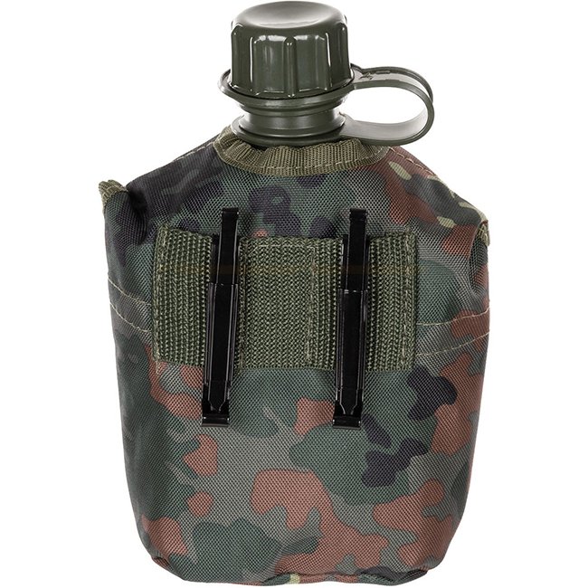 MFH US Canteen & Cover 1 l - Flecktarn: Screw cap, padded cover, external pocket, 2 clips for fixation. Dimensions: ca. 13 x 21 x 8 cm. Weight: ca. 200 g. Materials: Bottle - 100% Polyethylene, Cover - 100% Polyester.