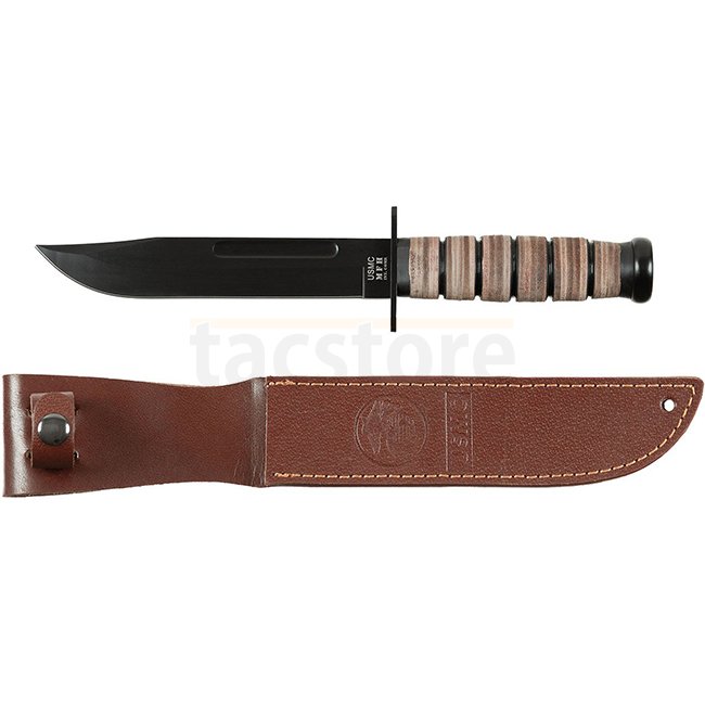 Blackened blade with smooth edge as well as partial fuller on both sides metal cross-guard handle consists of single, pressed leather rings sewn leather sheath with belt loop and handle holder with press button as well as a fastening eyelet with "USMC" letter embossing and "USMC" logo Total length: ca. 30,5 cm Blade: ca. 17,5 cm Weight knife: ca. 290 g Weight with sheath: ca. 390 g