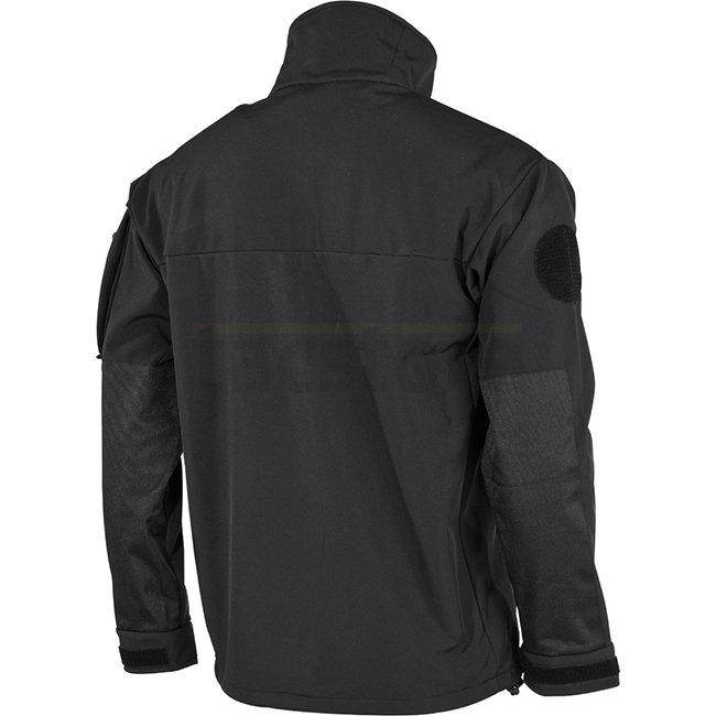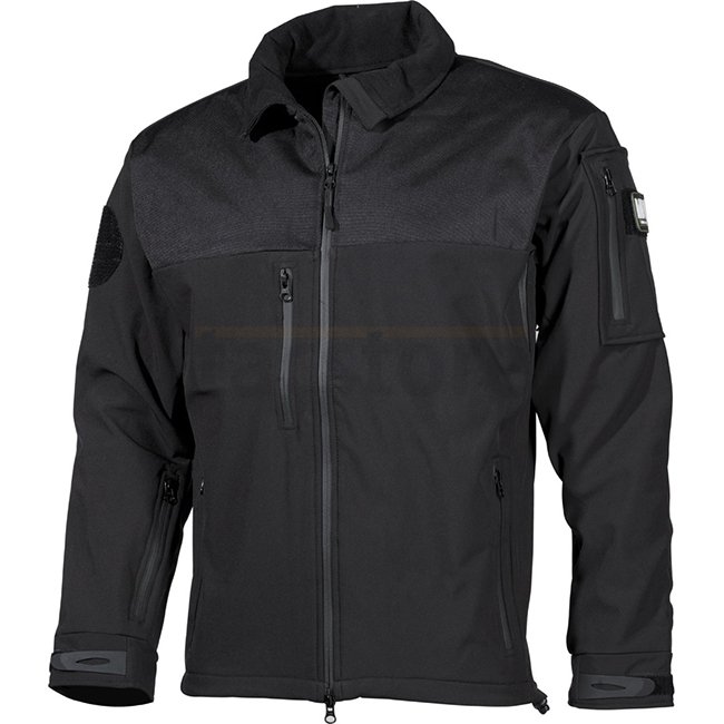 MFHHighDefence AUSTRALIA Soft Shell Jacket in Black - 2XL. Waterproof, windproof, and breathable with multiple pockets, reinforced elbows and chest area, adjustable sleeve ends, and drawstring waist. Material: 96% Polyester, 4% Elastane. Lining: 100% Poly