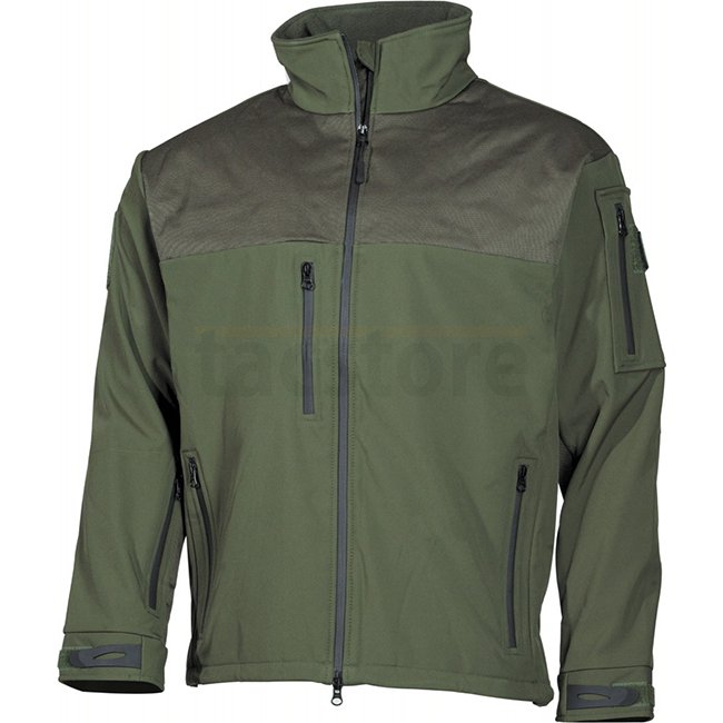 MFHHighDefence AUSTRALIA Soft Shell Jacket in Olive - S. Waterproof, windproof, breathable. Multiple pockets with zips, velcro patches, and adjustable features. Reinforced elbows and chest area for durability. Ideal for outdoor activities with a stylish t