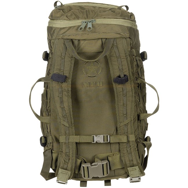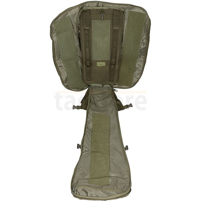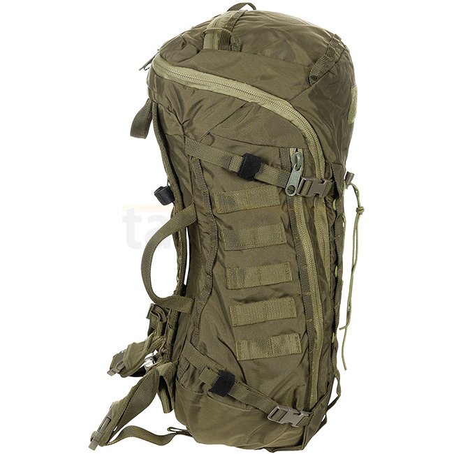 Adjustable, padded shoulder straps with loops adjustable chest- and waist straps 1 carrying handle on top and both sides velcro panel ca. 8 x 5 cm on the top frontside lid pocket with zip and inside carabiner main compartment completely unfoldable with 2-way zip, with zip pocket, back panel with lateral Molle attachment loops, carabiner and 2 removable aluminium rods 3 elongated inside velcro panels: 1 x ca. 45 x 9,5 cm, 2 x ca. 47 x 9,5 cm for fastening of optional pouches (item nos.: 30305, 30306, 30307, 30308) 2 concealed openings for hydration pack on top front with elastic drawstring with stopper and laterally running Molle attachment loops 2 side pockets with zip, 2 compression straps apiece, Molle attachment loops and openings for hydration pack on top Capacity: ca. 30 l Dimensions: ca. 30 x 55 x 25 cm (W x H x D) Weight: ca. 1,5 kg
