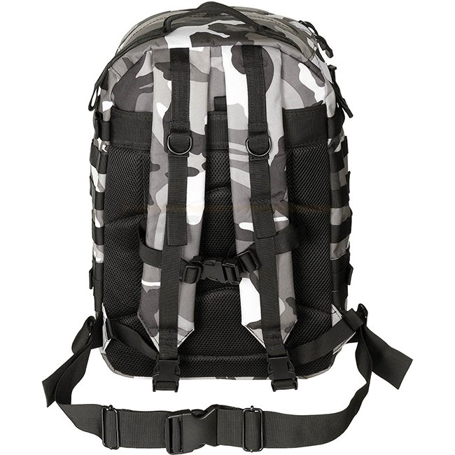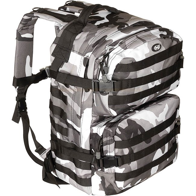 MFHHighDefence US Backpack Assault 2 - Urban Camo: Adjustable, padded shoulder straps, detachable chest- and waist straps, breathable mesh material, hydration pack compartment, multiple pockets, Molle attachment loops. 40L capacity, 30 x 48 x 27 cm, 1.25