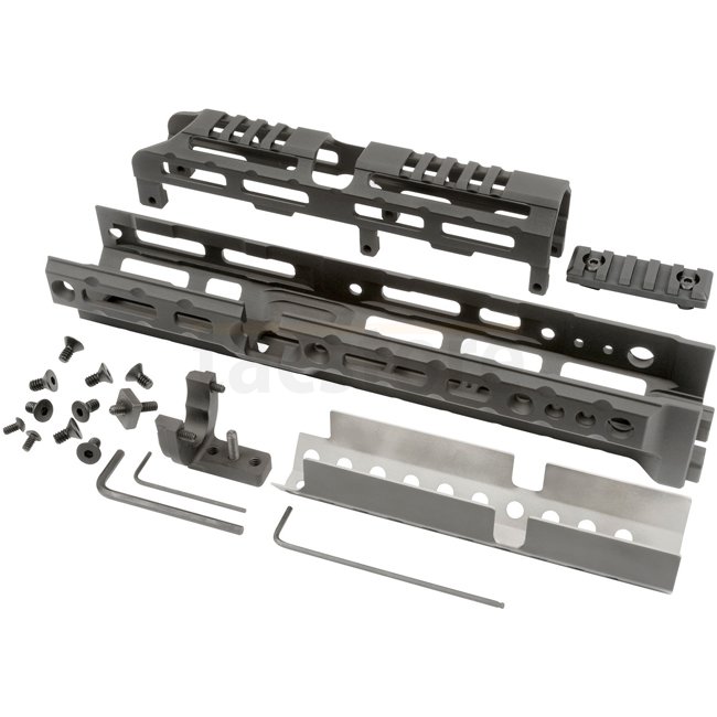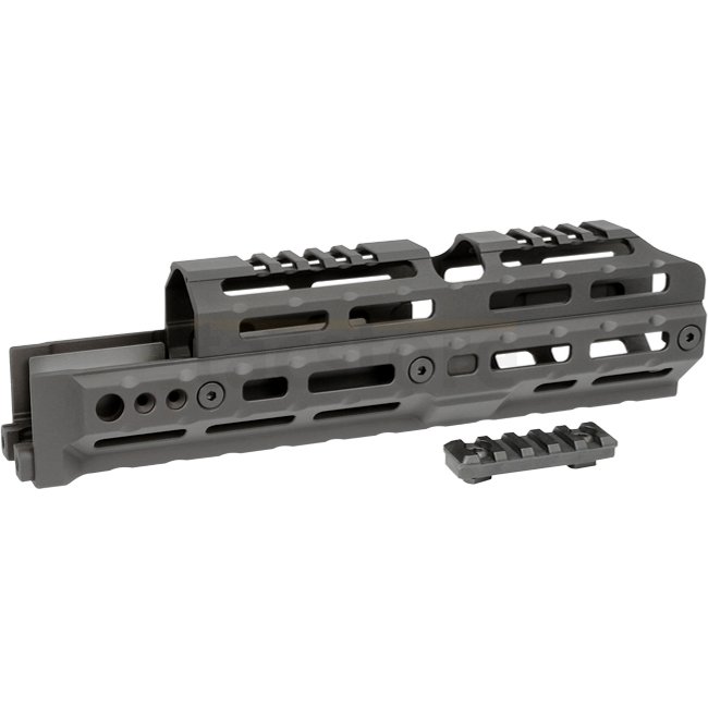 High-quality Midwest Industries Alpha Series AK Handguard 10 M-LOK is perfect for most AKM models, featuring a heat shield, QD sockets, and M-Lok mounting options on three sides. Made of durable aluminum, this handguard is 254mm long, weighs 323.2g, and o