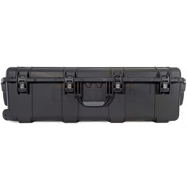 Extra-large wheeled protective case constructed from NK-7 resin with six PowerClaw latches, automatic pressure-release valve, soft-grip handle, multiple carry handles and heavy-duty wheels. The factory 4-UP Rifle closed-cell foam insert secures four rifles with mounted optics plus magazines and accessories.