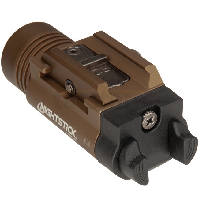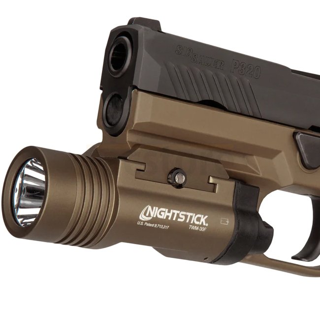 Nightstick TWM-30FD Light - Dark Earth flashlight provides 1200 lumens output, with a 1.75h runtime, a range of 194m, and IPX-7 waterproof casing. It utilizes LED light source, powered by 2x CR123 batteries. Compact and lightweight, perfect for Picatinny