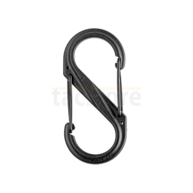 Nite Ize S-Biner Plastic #4 in sleek black color and compact design; Dimensions: 3.49" x 1.62" x 0.34". Holds up to 25 lbs. Warning: Not for climbing or situations where disengagement could lead to injury.