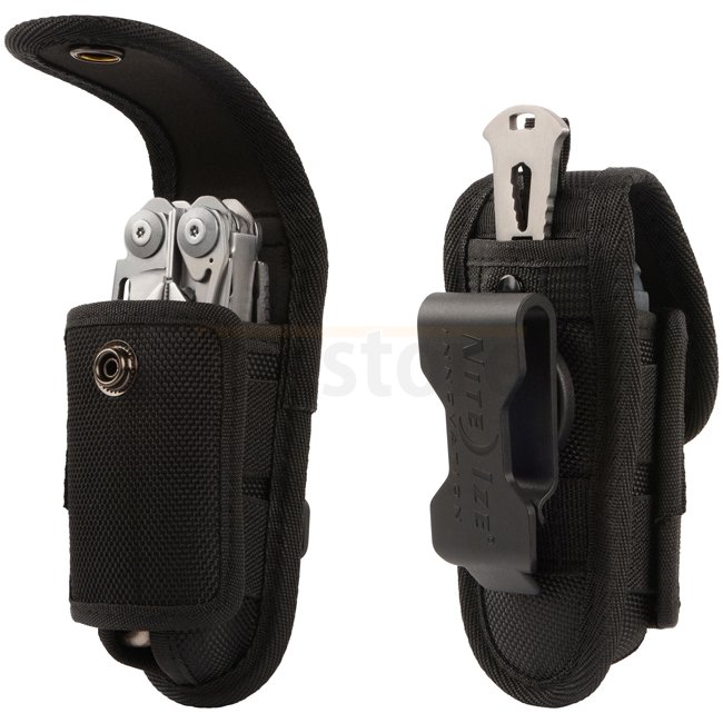 This universal multi-tool holster features snap closure and expandable elastic side panels to fit tools and knives of almost any size. Rugged rotating clip securely attaches to belts or waistbands, locking in 8 positions.