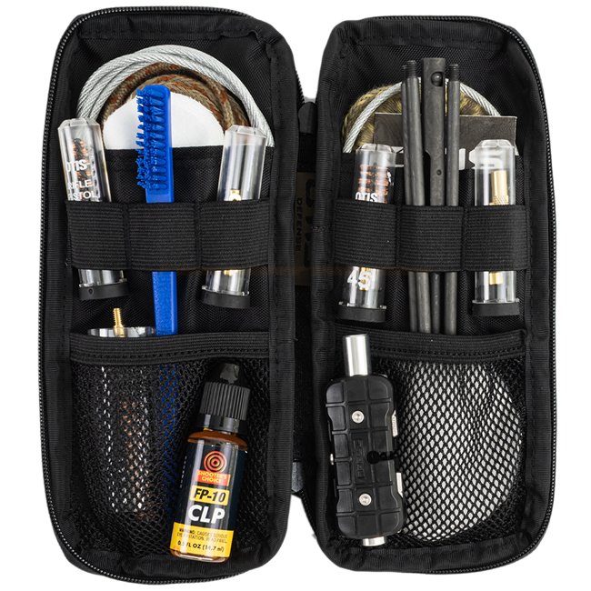 Cleaning Kit designed for .223 cal/5.56mm rifles and .45 cal pistols, stored in a soft case measuring 25 x 10 x 5cm. Made in the USA.
