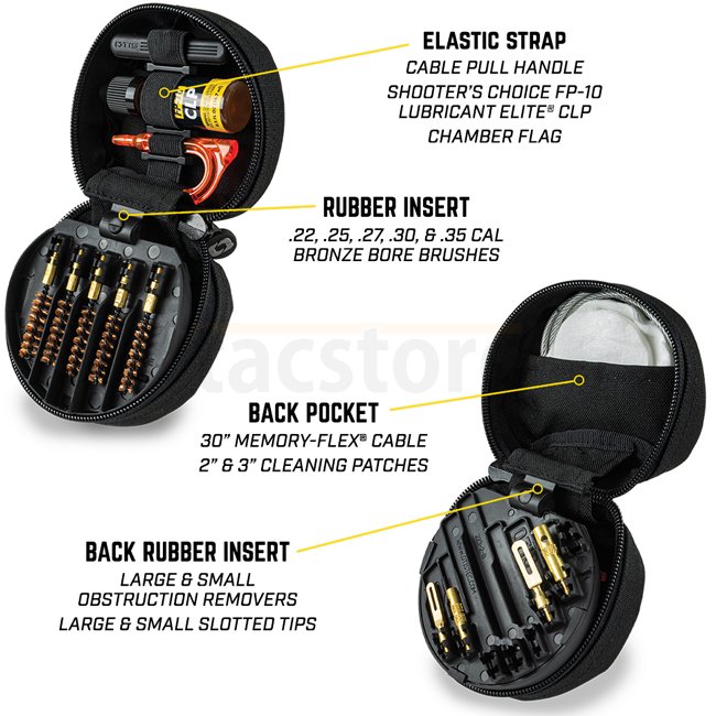 Universal rifle cleaning kit packed neatly in a 10 x 10 x 6cm soft pack case. Made in the USA.