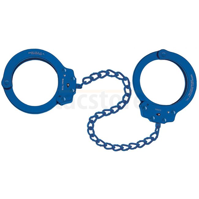 Peerless Model 755C Oversize Leg Iron in navy color, featuring all-steel construction with spun rivets. Meets National Institute of Justice standards for workmanship, strength, tamper resistance, and corrosion resistance. Chain length 38cm for limited ran