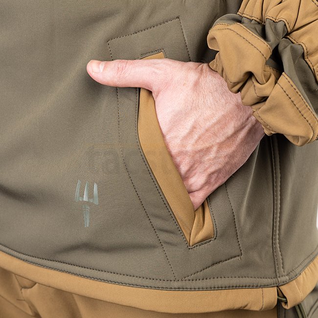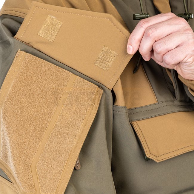 The front centered chest pouch contains mesh separations to hold equipment such as radios or phones. In between those pockets, loop surface can take on the separately sold Pitchfork Velcro Organisers and therefore even more gear you want to keep close to you. The hand pocket consists of a pass-through pocket that is lined with fleece material.