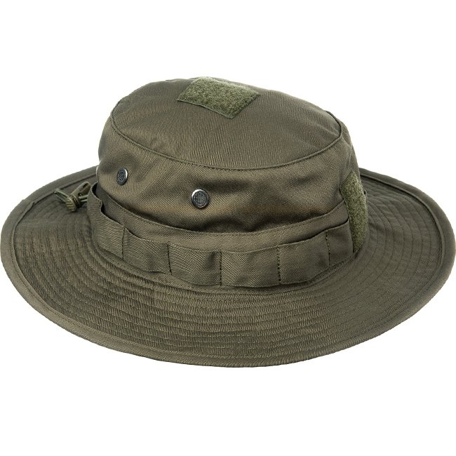 While keeping the classic shape of a boonie hat, the top is slightly slanted measuring 40mm high in the front and 50mm in the back. On the upper area a 50 x 50mm loop surface can be found to attach an IR reflective patch. On the sides eyelets for air circulation can be found: Small enough to keep rain out, large enough to ensure basic ventilation. Around the hat we used the same polyester-cotton material instead of stiff webbing ensuring an all-around low IR signature. Hidden underneath the circumference a shock cord is sewn in that allows infinitely variable size adjustment for a perfect fit, keeping the selected size by a cord stopper in the back. The brim is slightly less wide than usual. Just right as we find. All other features found on standard models like the chin strap or a neck cover have been left away. Functionality thru simplicity.