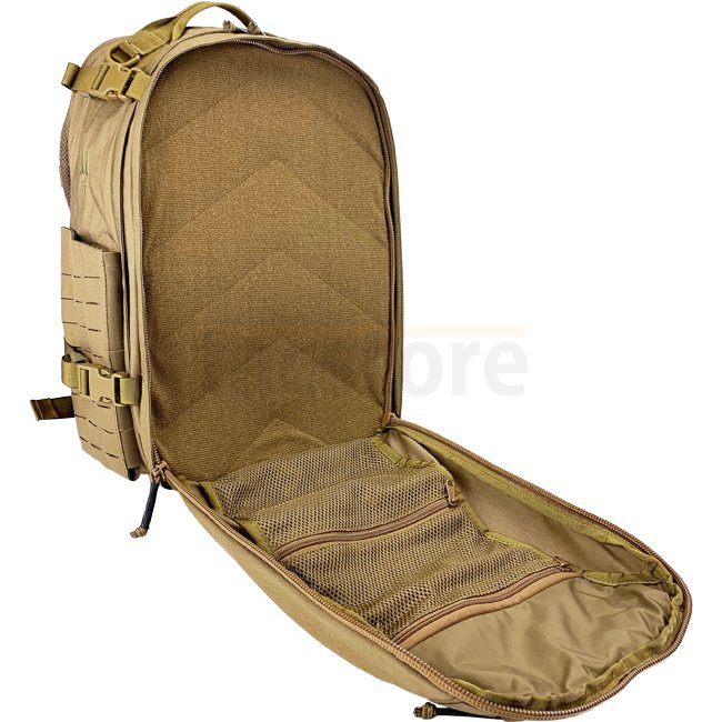 The shoulder straps come with small hook & loop rectangle on the front to attach a country or ID patch, a fully adjustable sternum strap as well as fast-release buckles to take off the pack. Laser-cut MOLLE surfaces provide additional installation space for pouches and accessories like a compass or other items you may need access to. Vertical slits can be used to install loops for holding a hydration tube or cables in place.