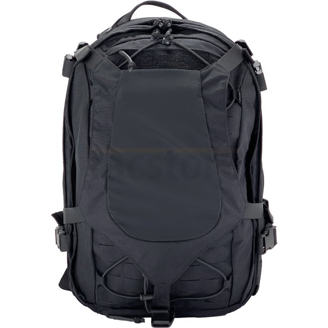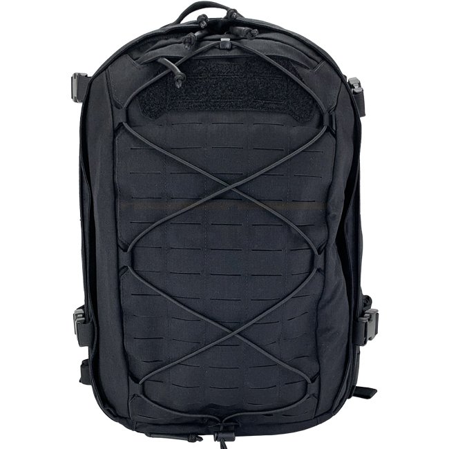 A large laser-cut surface permits the installation of MOLLE-system based pouches onto the backpack to further extend its capacity. Optionally, a shock cord zig-zags the entire back side creating a net to hold light objects such as a jacket. On the top it is held in place by a hook with quick detachable abilities and on the bottom the shock cord can be looped thru an eyelet and fastened by a cord stopper.